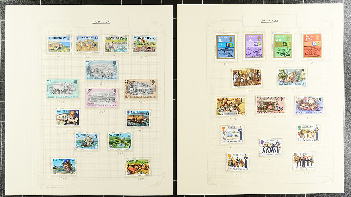 A combined Channel Islands collection of Guernsey (1941-1992, 668 stamps, Scott US$366.90) and Isle of Man (1958-1992, 649 stamps, Scott US$463.55), all neatly on quadrille pages within a blue Rapkin springback album. Mostly mint, with the odd used set present, being mostly Hinged material, arranged in mounts, eventually shifting to Never Hinged stamps by the 1980's. Well laid out and mounted with care by the previous owner. Total 2024 Scott US$830.45 =