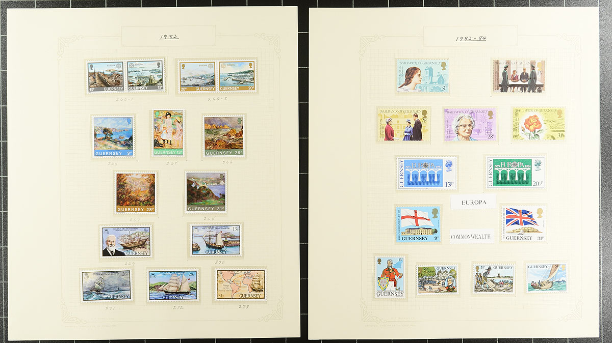 A combined Channel Islands collection of Guernsey (1941-1992, 668 stamps, Scott US$366.90) and Isle of Man (1958-1992, 649 stamps, Scott US$463.55), all neatly on quadrille pages within a blue Rapkin springback album. Mostly mint, with the odd used set present, being mostly Hinged material, arranged in mounts, eventually shifting to Never Hinged stamps by the 1980's. Well laid out and mounted with care by the previous owner. Total 2024 Scott US$830.45 =