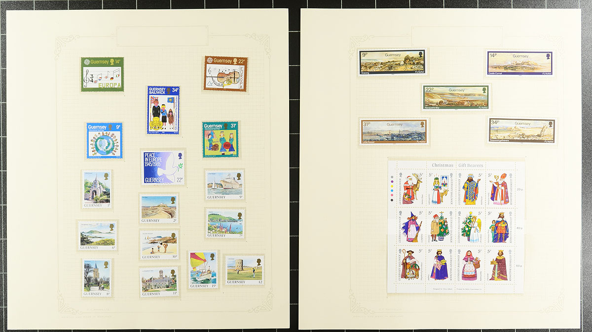 A combined Channel Islands collection of Guernsey (1941-1992, 668 stamps, Scott US$366.90) and Isle of Man (1958-1992, 649 stamps, Scott US$463.55), all neatly on quadrille pages within a blue Rapkin springback album. Mostly mint, with the odd used set present, being mostly Hinged material, arranged in mounts, eventually shifting to Never Hinged stamps by the 1980's. Well laid out and mounted with care by the previous owner. Total 2024 Scott US$830.45 =