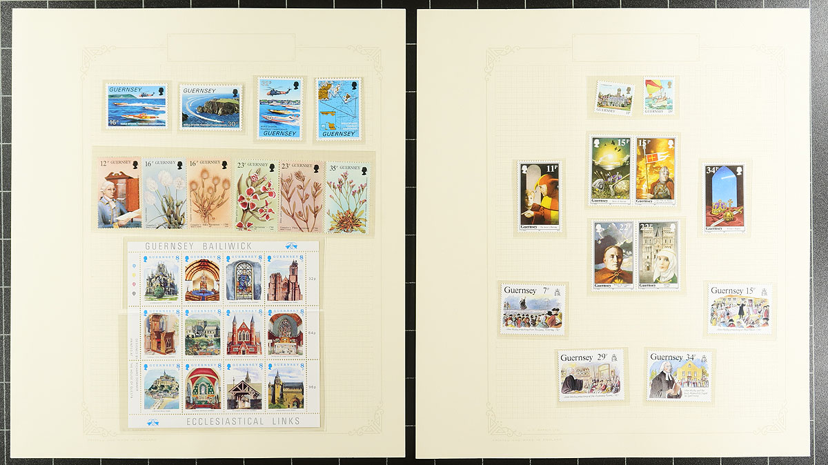 A combined Channel Islands collection of Guernsey (1941-1992, 668 stamps, Scott US$366.90) and Isle of Man (1958-1992, 649 stamps, Scott US$463.55), all neatly on quadrille pages within a blue Rapkin springback album. Mostly mint, with the odd used set present, being mostly Hinged material, arranged in mounts, eventually shifting to Never Hinged stamps by the 1980's. Well laid out and mounted with care by the previous owner. Total 2024 Scott US$830.45 =