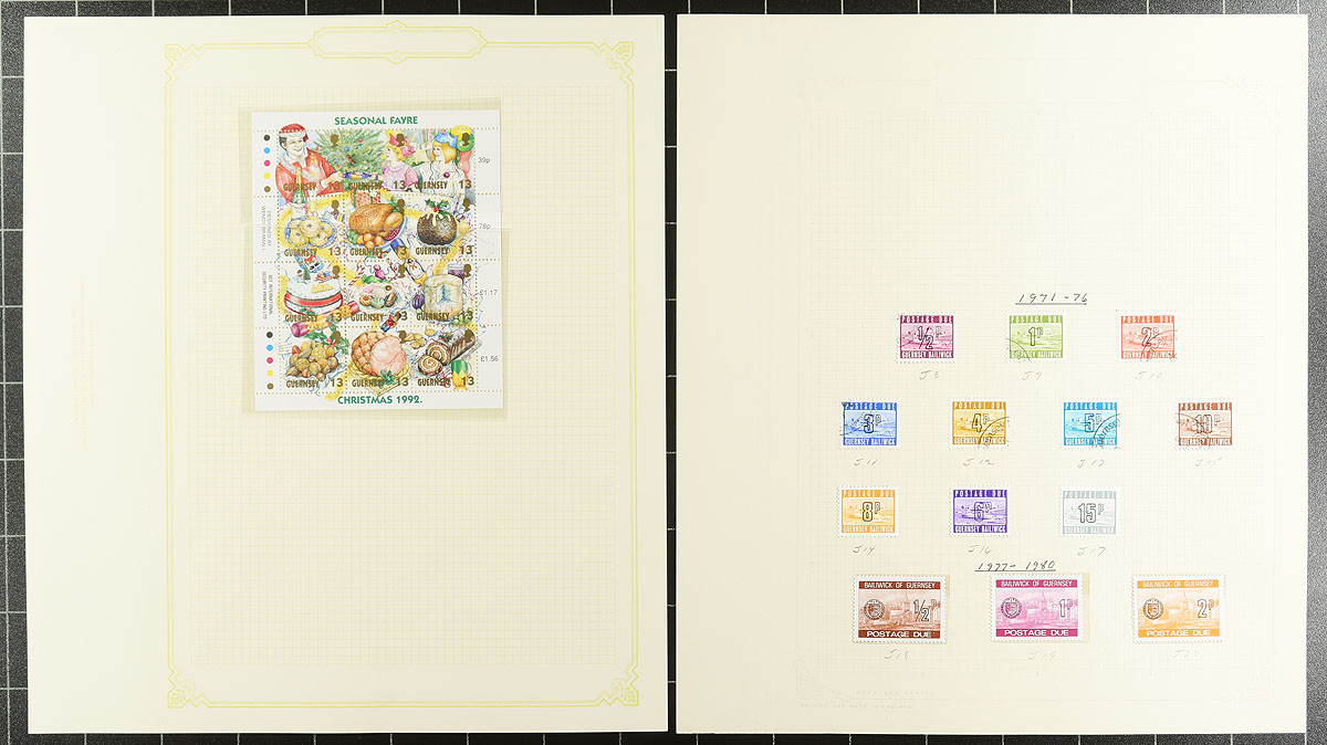 A combined Channel Islands collection of Guernsey (1941-1992, 668 stamps, Scott US$366.90) and Isle of Man (1958-1992, 649 stamps, Scott US$463.55), all neatly on quadrille pages within a blue Rapkin springback album. Mostly mint, with the odd used set present, being mostly Hinged material, arranged in mounts, eventually shifting to Never Hinged stamps by the 1980's. Well laid out and mounted with care by the previous owner. Total 2024 Scott US$830.45 =