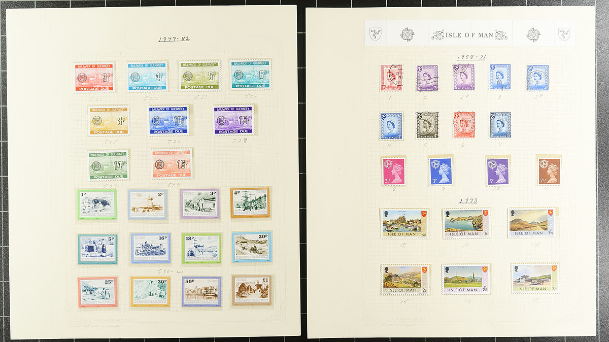 A combined Channel Islands collection of Guernsey (1941-1992, 668 stamps, Scott US$366.90) and Isle of Man (1958-1992, 649 stamps, Scott US$463.55), all neatly on quadrille pages within a blue Rapkin springback album. Mostly mint, with the odd used set present, being mostly Hinged material, arranged in mounts, eventually shifting to Never Hinged stamps by the 1980's. Well laid out and mounted with care by the previous owner. Total 2024 Scott US$830.45 =