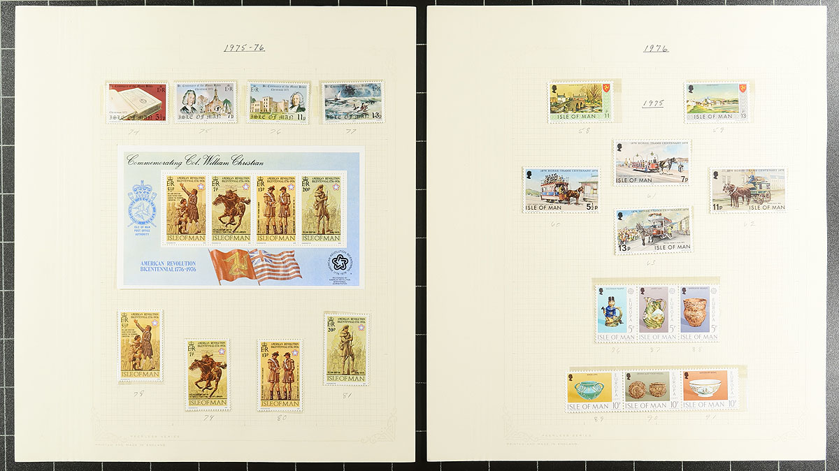 A combined Channel Islands collection of Guernsey (1941-1992, 668 stamps, Scott US$366.90) and Isle of Man (1958-1992, 649 stamps, Scott US$463.55), all neatly on quadrille pages within a blue Rapkin springback album. Mostly mint, with the odd used set present, being mostly Hinged material, arranged in mounts, eventually shifting to Never Hinged stamps by the 1980's. Well laid out and mounted with care by the previous owner. Total 2024 Scott US$830.45 =