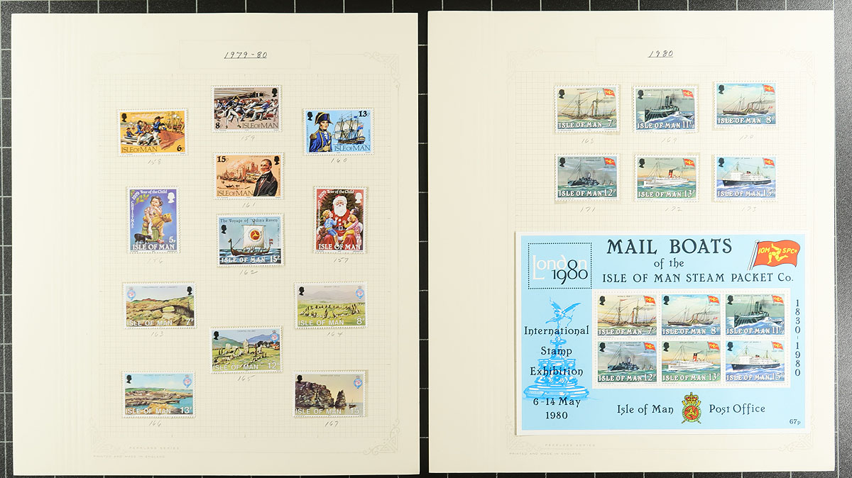 A combined Channel Islands collection of Guernsey (1941-1992, 668 stamps, Scott US$366.90) and Isle of Man (1958-1992, 649 stamps, Scott US$463.55), all neatly on quadrille pages within a blue Rapkin springback album. Mostly mint, with the odd used set present, being mostly Hinged material, arranged in mounts, eventually shifting to Never Hinged stamps by the 1980's. Well laid out and mounted with care by the previous owner. Total 2024 Scott US$830.45 =