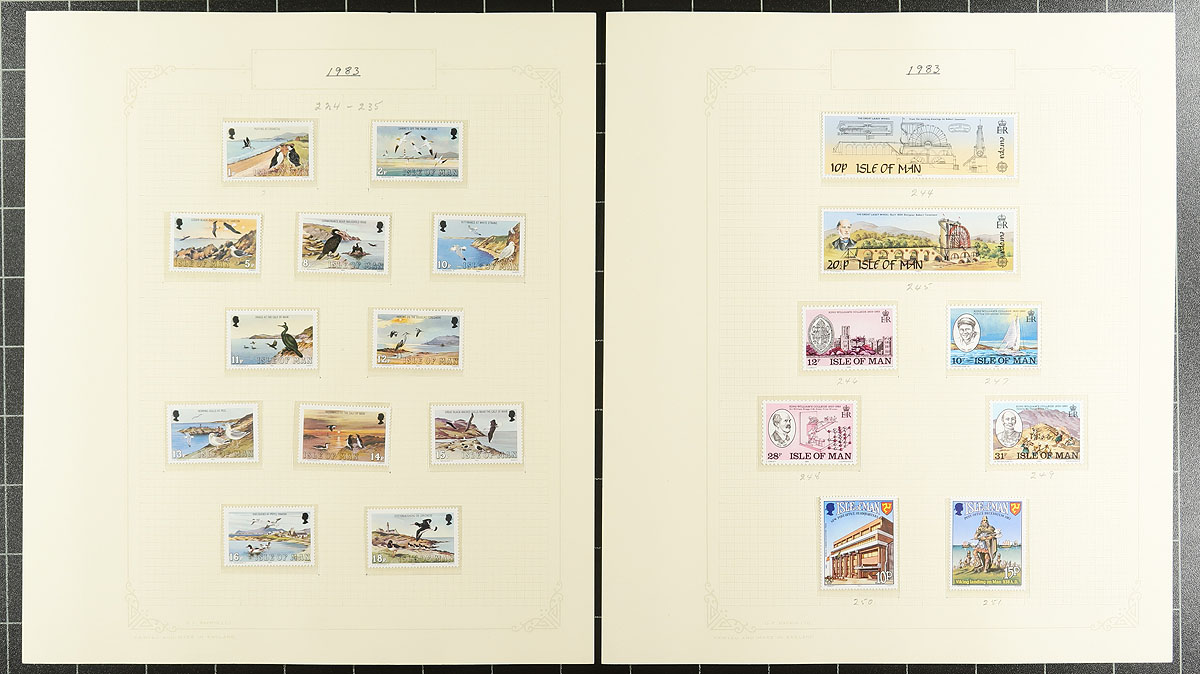 A combined Channel Islands collection of Guernsey (1941-1992, 668 stamps, Scott US$366.90) and Isle of Man (1958-1992, 649 stamps, Scott US$463.55), all neatly on quadrille pages within a blue Rapkin springback album. Mostly mint, with the odd used set present, being mostly Hinged material, arranged in mounts, eventually shifting to Never Hinged stamps by the 1980's. Well laid out and mounted with care by the previous owner. Total 2024 Scott US$830.45 =