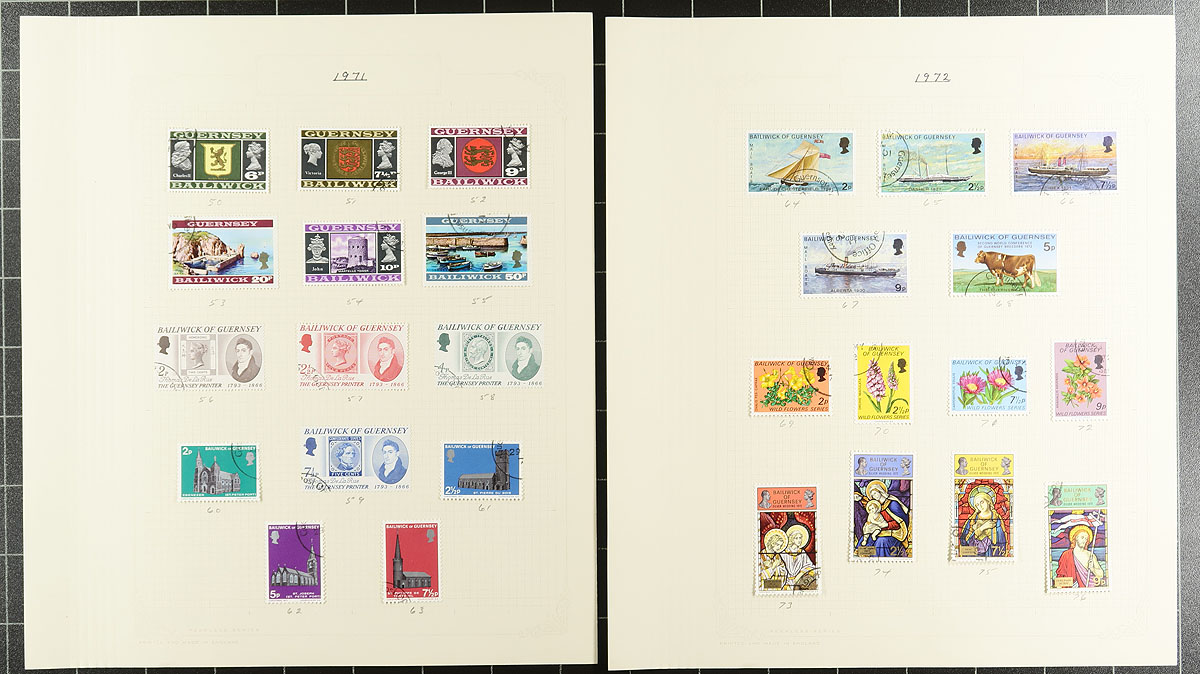 A combined Channel Islands collection of Guernsey (1941-1992, 668 stamps, Scott US$366.90) and Isle of Man (1958-1992, 649 stamps, Scott US$463.55), all neatly on quadrille pages within a blue Rapkin springback album. Mostly mint, with the odd used set present, being mostly Hinged material, arranged in mounts, eventually shifting to Never Hinged stamps by the 1980's. Well laid out and mounted with care by the previous owner. Total 2024 Scott US$830.45 =