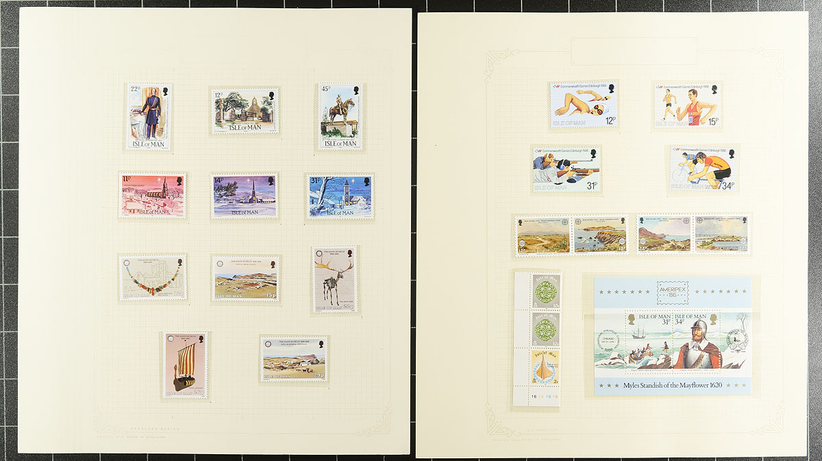A combined Channel Islands collection of Guernsey (1941-1992, 668 stamps, Scott US$366.90) and Isle of Man (1958-1992, 649 stamps, Scott US$463.55), all neatly on quadrille pages within a blue Rapkin springback album. Mostly mint, with the odd used set present, being mostly Hinged material, arranged in mounts, eventually shifting to Never Hinged stamps by the 1980's. Well laid out and mounted with care by the previous owner. Total 2024 Scott US$830.45 =