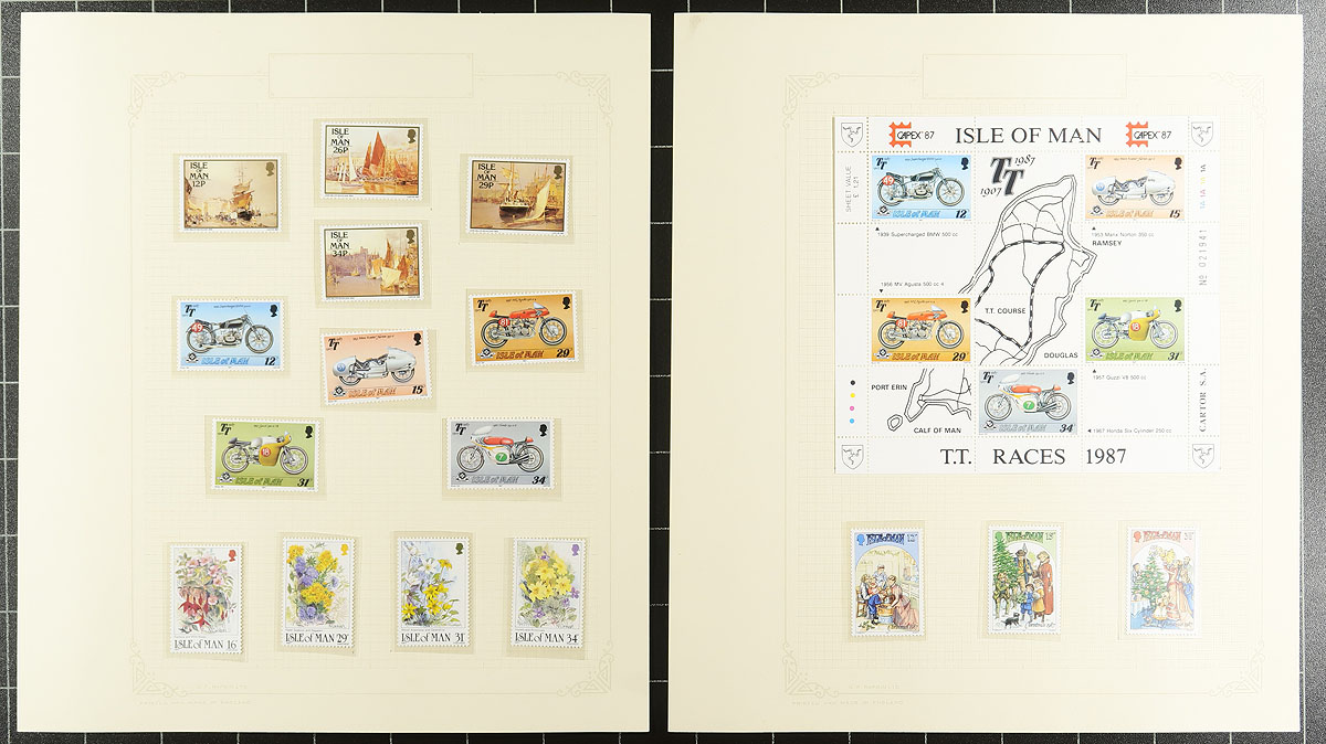 A combined Channel Islands collection of Guernsey (1941-1992, 668 stamps, Scott US$366.90) and Isle of Man (1958-1992, 649 stamps, Scott US$463.55), all neatly on quadrille pages within a blue Rapkin springback album. Mostly mint, with the odd used set present, being mostly Hinged material, arranged in mounts, eventually shifting to Never Hinged stamps by the 1980's. Well laid out and mounted with care by the previous owner. Total 2024 Scott US$830.45 =