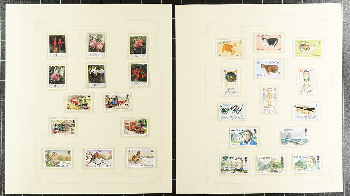 A combined Channel Islands collection of Guernsey (1941-1992, 668 stamps, Scott US$366.90) and Isle of Man (1958-1992, 649 stamps, Scott US$463.55), all neatly on quadrille pages within a blue Rapkin springback album. Mostly mint, with the odd used set present, being mostly Hinged material, arranged in mounts, eventually shifting to Never Hinged stamps by the 1980's. Well laid out and mounted with care by the previous owner. Total 2024 Scott US$830.45 =