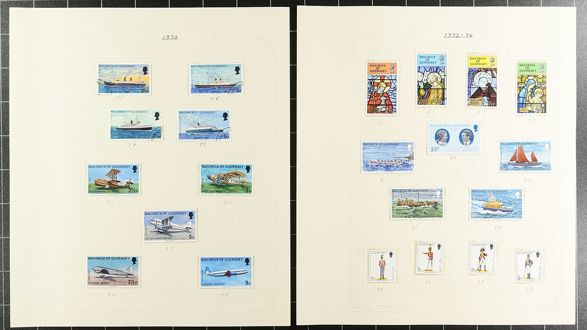 A combined Channel Islands collection of Guernsey (1941-1992, 668 stamps, Scott US$366.90) and Isle of Man (1958-1992, 649 stamps, Scott US$463.55), all neatly on quadrille pages within a blue Rapkin springback album. Mostly mint, with the odd used set present, being mostly Hinged material, arranged in mounts, eventually shifting to Never Hinged stamps by the 1980's. Well laid out and mounted with care by the previous owner. Total 2024 Scott US$830.45 =