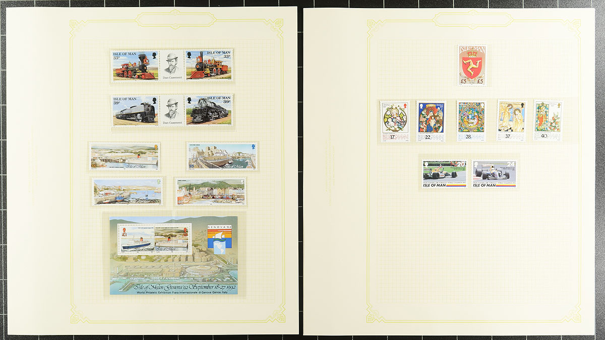 A combined Channel Islands collection of Guernsey (1941-1992, 668 stamps, Scott US$366.90) and Isle of Man (1958-1992, 649 stamps, Scott US$463.55), all neatly on quadrille pages within a blue Rapkin springback album. Mostly mint, with the odd used set present, being mostly Hinged material, arranged in mounts, eventually shifting to Never Hinged stamps by the 1980's. Well laid out and mounted with care by the previous owner. Total 2024 Scott US$830.45 =
