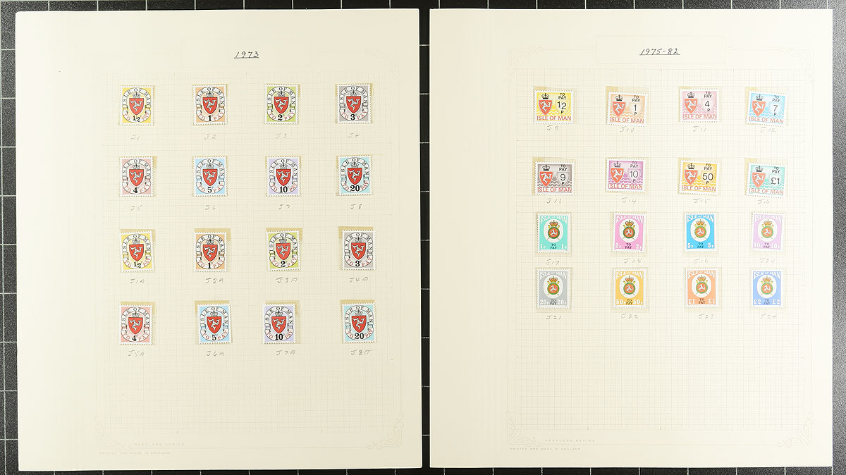 A combined Channel Islands collection of Guernsey (1941-1992, 668 stamps, Scott US$366.90) and Isle of Man (1958-1992, 649 stamps, Scott US$463.55), all neatly on quadrille pages within a blue Rapkin springback album. Mostly mint, with the odd used set present, being mostly Hinged material, arranged in mounts, eventually shifting to Never Hinged stamps by the 1980's. Well laid out and mounted with care by the previous owner. Total 2024 Scott US$830.45 =