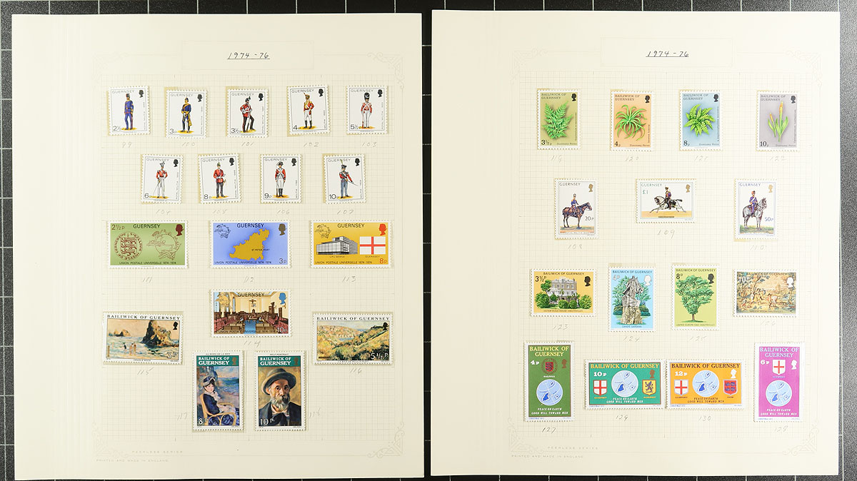 A combined Channel Islands collection of Guernsey (1941-1992, 668 stamps, Scott US$366.90) and Isle of Man (1958-1992, 649 stamps, Scott US$463.55), all neatly on quadrille pages within a blue Rapkin springback album. Mostly mint, with the odd used set present, being mostly Hinged material, arranged in mounts, eventually shifting to Never Hinged stamps by the 1980's. Well laid out and mounted with care by the previous owner. Total 2024 Scott US$830.45 =