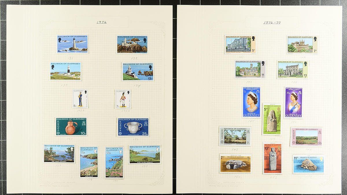 A combined Channel Islands collection of Guernsey (1941-1992, 668 stamps, Scott US$366.90) and Isle of Man (1958-1992, 649 stamps, Scott US$463.55), all neatly on quadrille pages within a blue Rapkin springback album. Mostly mint, with the odd used set present, being mostly Hinged material, arranged in mounts, eventually shifting to Never Hinged stamps by the 1980's. Well laid out and mounted with care by the previous owner. Total 2024 Scott US$830.45 =