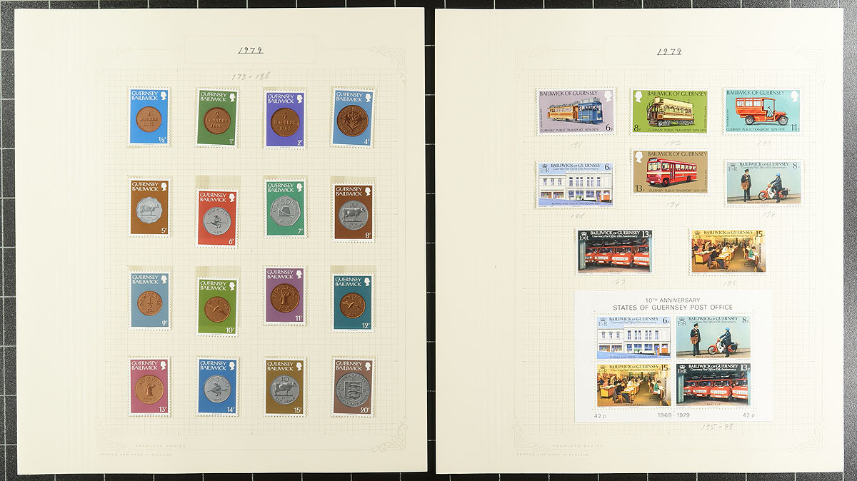 A combined Channel Islands collection of Guernsey (1941-1992, 668 stamps, Scott US$366.90) and Isle of Man (1958-1992, 649 stamps, Scott US$463.55), all neatly on quadrille pages within a blue Rapkin springback album. Mostly mint, with the odd used set present, being mostly Hinged material, arranged in mounts, eventually shifting to Never Hinged stamps by the 1980's. Well laid out and mounted with care by the previous owner. Total 2024 Scott US$830.45 =