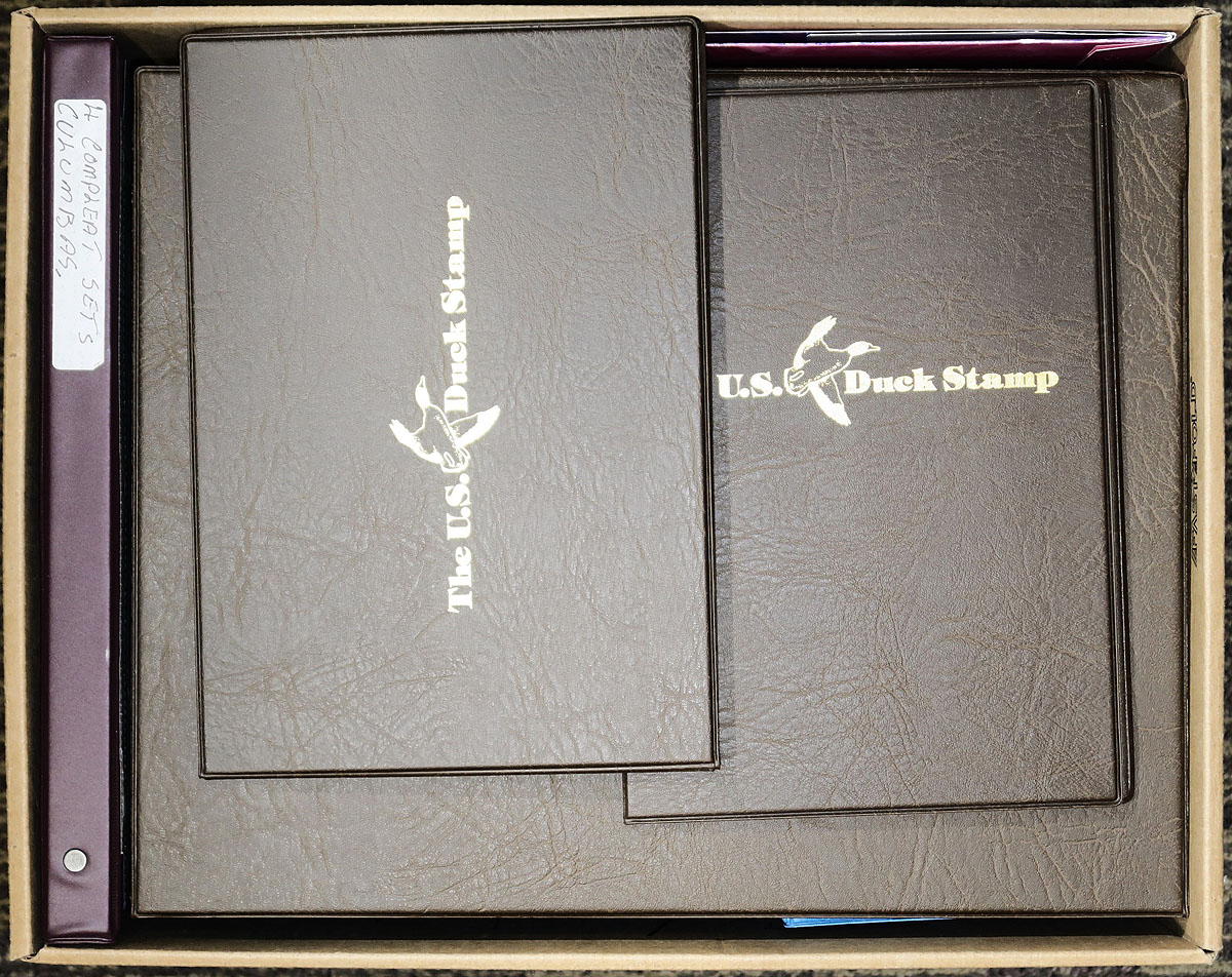 Bankers Box Estate Offering. A large offering of over 30 mostly smaller format "prepared collections" of USA stamp and "Duck Stamp" FDC / presentation sheet issues. These wonderfully laid out issues often offer a format of FDC / presentation card that are unavailable anywhere else. We noted 1992 Columbus issue (3x sets), 1992 National Audubon Society, 1985 Folk Art, 1990 (x2) and 1991 (x2) "Wild Turkey" Hunting Stamp, 1991 (x3) and 1992 "Duck Stamp", 1990 Lighthouses x3, 1990 First Nation Chiefs x4, 1991 William Saroyan x2, 1977 "Old Glory" Flag, 1995 Marilyn Monroe, 1993 "Proofcard Society" Albums x2 (likely a near complete run for the year), 1992 Columbus "maximum card style" postcard FDC (4 sets), 1990 Classic Films, 1993 Oregon Trail, 1990 USA / Russia joint-issue "Sealife" and last (but not least) 1992 Migratory Bird Hunting Stamp / Limited Edition print, signed by artist Don Balke. Where multiple examples are noted, these are usually different formats. Significant original cost. Estimate =