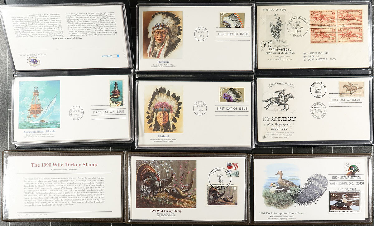 Bankers Box Estate Offering. A large offering of over 30 mostly smaller format "prepared collections" of USA stamp and "Duck Stamp" FDC / presentation sheet issues. These wonderfully laid out issues often offer a format of FDC / presentation card that are unavailable anywhere else. We noted 1992 Columbus issue (3x sets), 1992 National Audubon Society, 1985 Folk Art, 1990 (x2) and 1991 (x2) "Wild Turkey" Hunting Stamp, 1991 (x3) and 1992 "Duck Stamp", 1990 Lighthouses x3, 1990 First Nation Chiefs x4, 1991 William Saroyan x2, 1977 "Old Glory" Flag, 1995 Marilyn Monroe, 1993 "Proofcard Society" Albums x2 (likely a near complete run for the year), 1992 Columbus "maximum card style" postcard FDC (4 sets), 1990 Classic Films, 1993 Oregon Trail, 1990 USA / Russia joint-issue "Sealife" and last (but not least) 1992 Migratory Bird Hunting Stamp / Limited Edition print, signed by artist Don Balke. Where multiple examples are noted, these are usually different formats. Significant original cost. Estimate =
