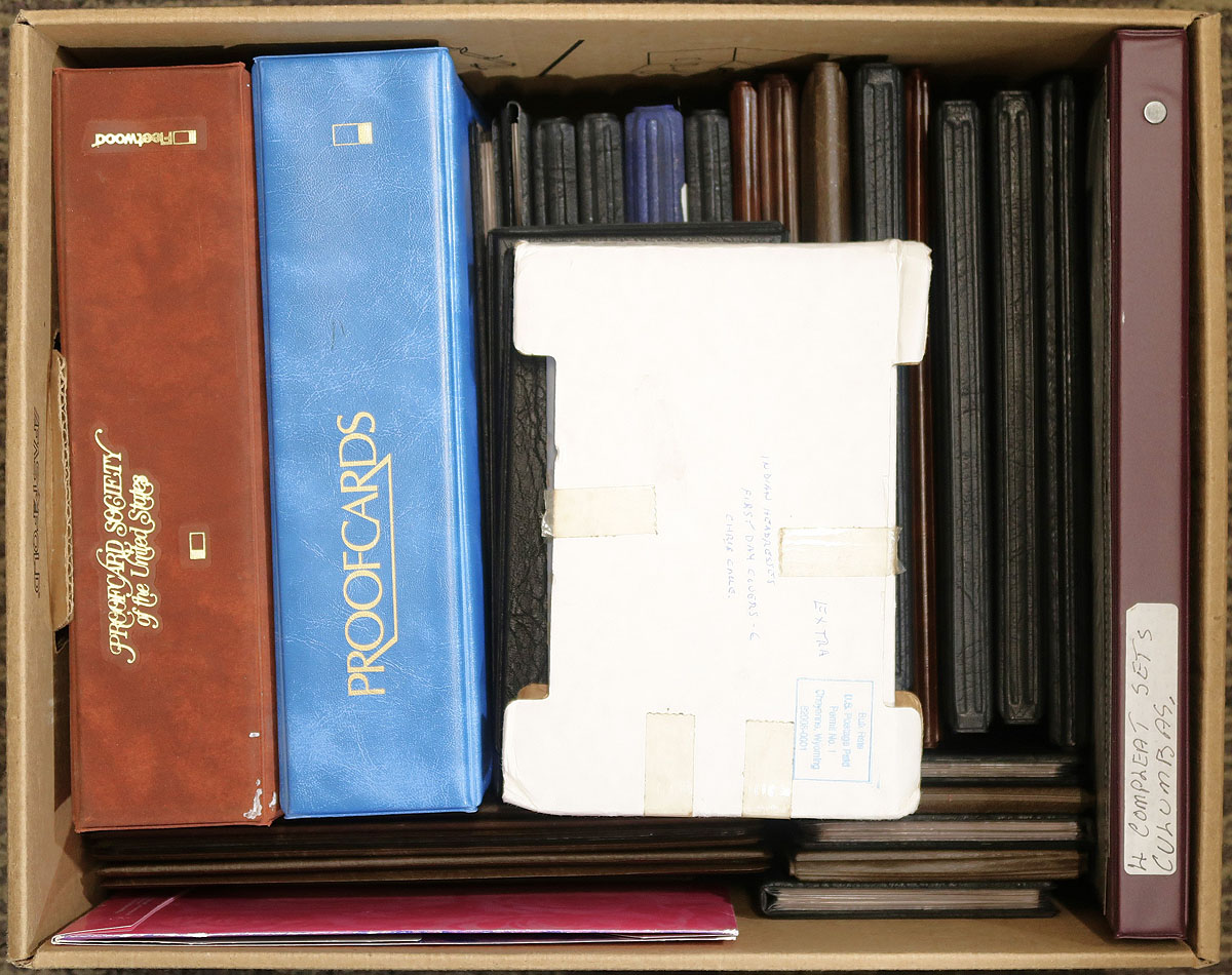 Bankers Box Estate Offering. A large offering of over 30 mostly smaller format "prepared collections" of USA stamp and "Duck Stamp" FDC / presentation sheet issues. These wonderfully laid out issues often offer a format of FDC / presentation card that are unavailable anywhere else. We noted 1992 Columbus issue (3x sets), 1992 National Audubon Society, 1985 Folk Art, 1990 (x2) and 1991 (x2) "Wild Turkey" Hunting Stamp, 1991 (x3) and 1992 "Duck Stamp", 1990 Lighthouses x3, 1990 First Nation Chiefs x4, 1991 William Saroyan x2, 1977 "Old Glory" Flag, 1995 Marilyn Monroe, 1993 "Proofcard Society" Albums x2 (likely a near complete run for the year), 1992 Columbus "maximum card style" postcard FDC (4 sets), 1990 Classic Films, 1993 Oregon Trail, 1990 USA / Russia joint-issue "Sealife" and last (but not least) 1992 Migratory Bird Hunting Stamp / Limited Edition print, signed by artist Don Balke. Where multiple examples are noted, these are usually different formats. Significant original cost. Estimate =
