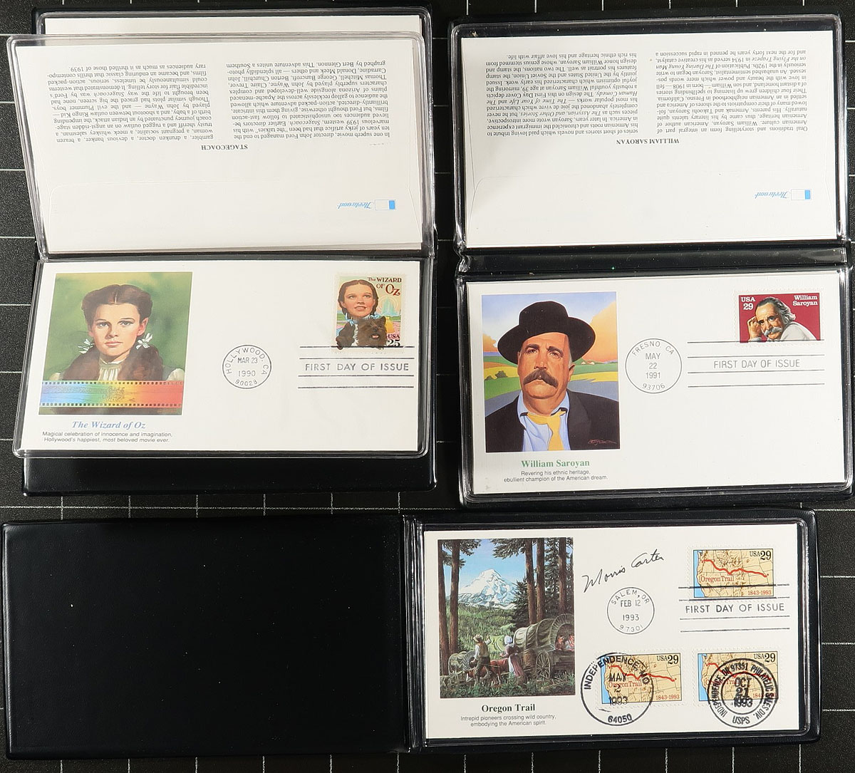 Bankers Box Estate Offering. A large offering of over 30 mostly smaller format "prepared collections" of USA stamp and "Duck Stamp" FDC / presentation sheet issues. These wonderfully laid out issues often offer a format of FDC / presentation card that are unavailable anywhere else. We noted 1992 Columbus issue (3x sets), 1992 National Audubon Society, 1985 Folk Art, 1990 (x2) and 1991 (x2) "Wild Turkey" Hunting Stamp, 1991 (x3) and 1992 "Duck Stamp", 1990 Lighthouses x3, 1990 First Nation Chiefs x4, 1991 William Saroyan x2, 1977 "Old Glory" Flag, 1995 Marilyn Monroe, 1993 "Proofcard Society" Albums x2 (likely a near complete run for the year), 1992 Columbus "maximum card style" postcard FDC (4 sets), 1990 Classic Films, 1993 Oregon Trail, 1990 USA / Russia joint-issue "Sealife" and last (but not least) 1992 Migratory Bird Hunting Stamp / Limited Edition print, signed by artist Don Balke. Where multiple examples are noted, these are usually different formats. Significant original cost. Estimate =