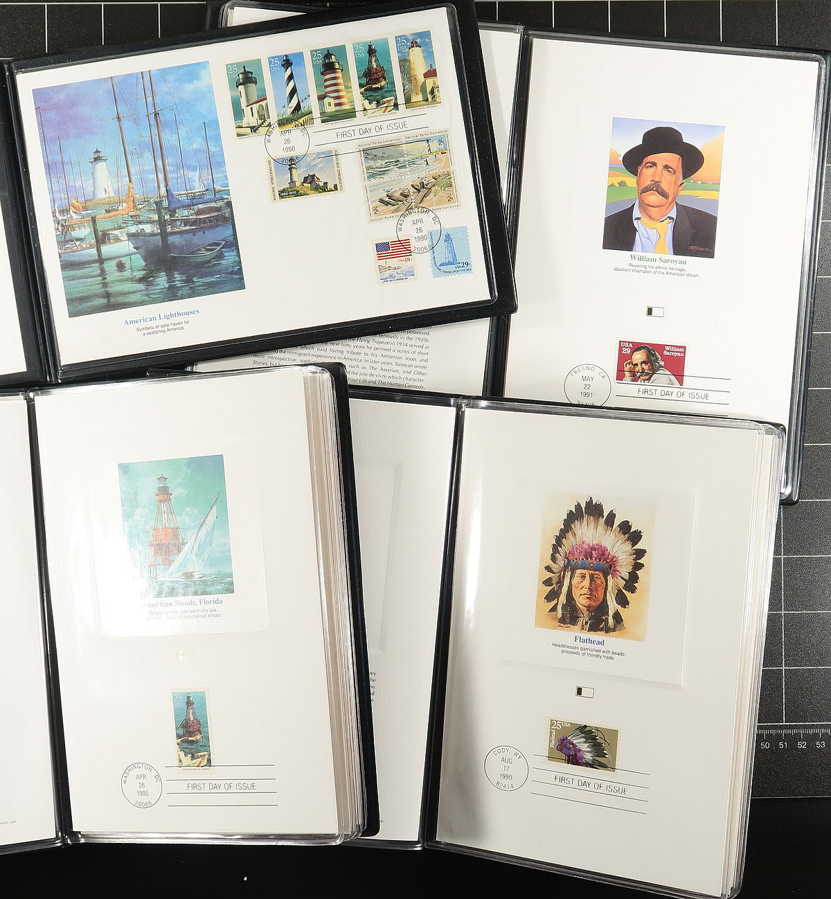 Bankers Box Estate Offering. A large offering of over 30 mostly smaller format "prepared collections" of USA stamp and "Duck Stamp" FDC / presentation sheet issues. These wonderfully laid out issues often offer a format of FDC / presentation card that are unavailable anywhere else. We noted 1992 Columbus issue (3x sets), 1992 National Audubon Society, 1985 Folk Art, 1990 (x2) and 1991 (x2) "Wild Turkey" Hunting Stamp, 1991 (x3) and 1992 "Duck Stamp", 1990 Lighthouses x3, 1990 First Nation Chiefs x4, 1991 William Saroyan x2, 1977 "Old Glory" Flag, 1995 Marilyn Monroe, 1993 "Proofcard Society" Albums x2 (likely a near complete run for the year), 1992 Columbus "maximum card style" postcard FDC (4 sets), 1990 Classic Films, 1993 Oregon Trail, 1990 USA / Russia joint-issue "Sealife" and last (but not least) 1992 Migratory Bird Hunting Stamp / Limited Edition print, signed by artist Don Balke. Where multiple examples are noted, these are usually different formats. Significant original cost. Estimate =