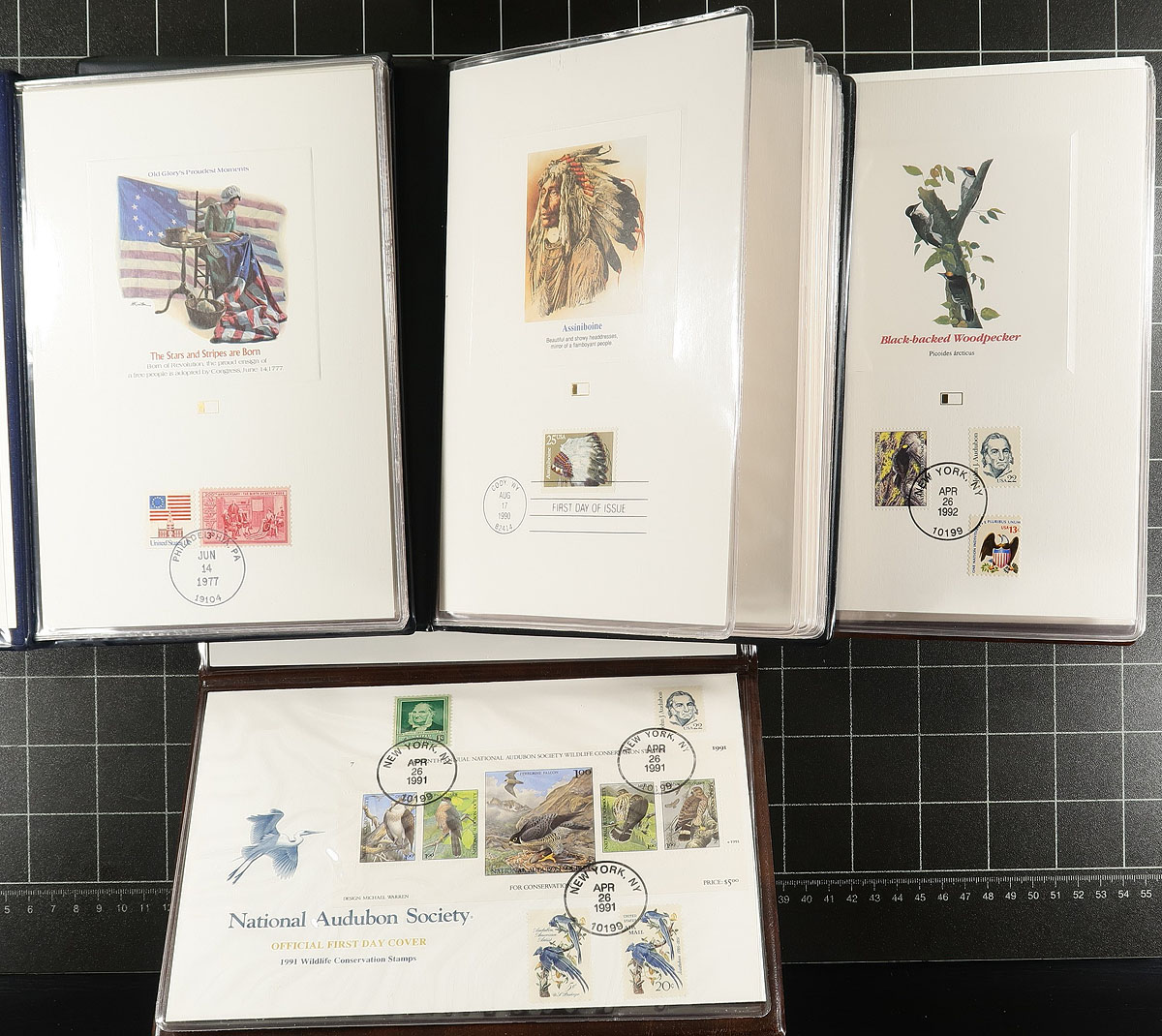 Bankers Box Estate Offering. A large offering of over 30 mostly smaller format "prepared collections" of USA stamp and "Duck Stamp" FDC / presentation sheet issues. These wonderfully laid out issues often offer a format of FDC / presentation card that are unavailable anywhere else. We noted 1992 Columbus issue (3x sets), 1992 National Audubon Society, 1985 Folk Art, 1990 (x2) and 1991 (x2) "Wild Turkey" Hunting Stamp, 1991 (x3) and 1992 "Duck Stamp", 1990 Lighthouses x3, 1990 First Nation Chiefs x4, 1991 William Saroyan x2, 1977 "Old Glory" Flag, 1995 Marilyn Monroe, 1993 "Proofcard Society" Albums x2 (likely a near complete run for the year), 1992 Columbus "maximum card style" postcard FDC (4 sets), 1990 Classic Films, 1993 Oregon Trail, 1990 USA / Russia joint-issue "Sealife" and last (but not least) 1992 Migratory Bird Hunting Stamp / Limited Edition print, signed by artist Don Balke. Where multiple examples are noted, these are usually different formats. Significant original cost. Estimate =