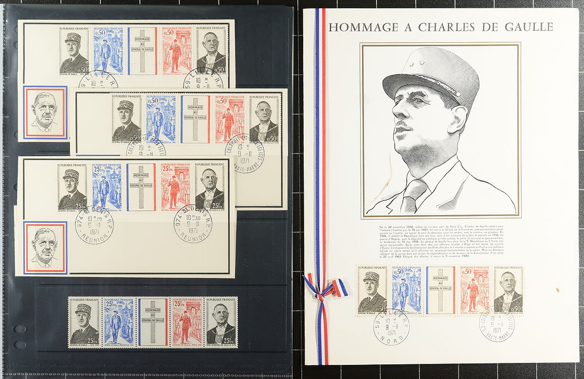 Small consignment balance on stockpages. Starts with a card with a few "Bordeaux" printings along with a "Postes/Paris/1921" precancel on a 30c Sower, and moves to a page of used from the "Peace and Commerce" issue (includes a couple of perfins). There is an assortment of 1920's-1950's issues, including a never hinged "Colonial Exposition" set. The General de Gaulle memorial strip is mint, three covers (different cachets) and a presentation folder (small stain). The back of the book includes a trio of pages of mint semi-postals and another with some airmails. Nice little group. Estimate =
