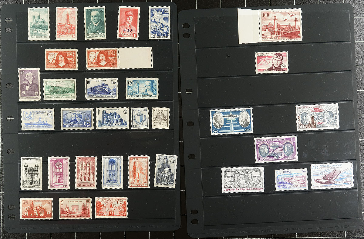 Small consignment balance on stockpages. Starts with a card with a few "Bordeaux" printings along with a "Postes/Paris/1921" precancel on a 30c Sower, and moves to a page of used from the "Peace and Commerce" issue (includes a couple of perfins). There is an assortment of 1920's-1950's issues, including a never hinged "Colonial Exposition" set. The General de Gaulle memorial strip is mint, three covers (different cachets) and a presentation folder (small stain). The back of the book includes a trio of pages of mint semi-postals and another with some airmails. Nice little group. Estimate =