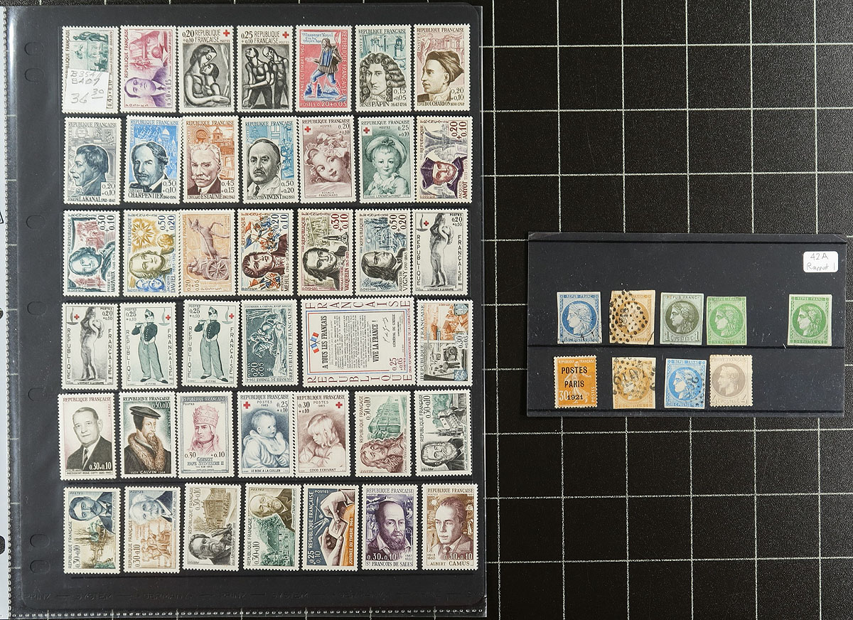 Small consignment balance on stockpages. Starts with a card with a few "Bordeaux" printings along with a "Postes/Paris/1921" precancel on a 30c Sower, and moves to a page of used from the "Peace and Commerce" issue (includes a couple of perfins). There is an assortment of 1920's-1950's issues, including a never hinged "Colonial Exposition" set. The General de Gaulle memorial strip is mint, three covers (different cachets) and a presentation folder (small stain). The back of the book includes a trio of pages of mint semi-postals and another with some airmails. Nice little group. Estimate =