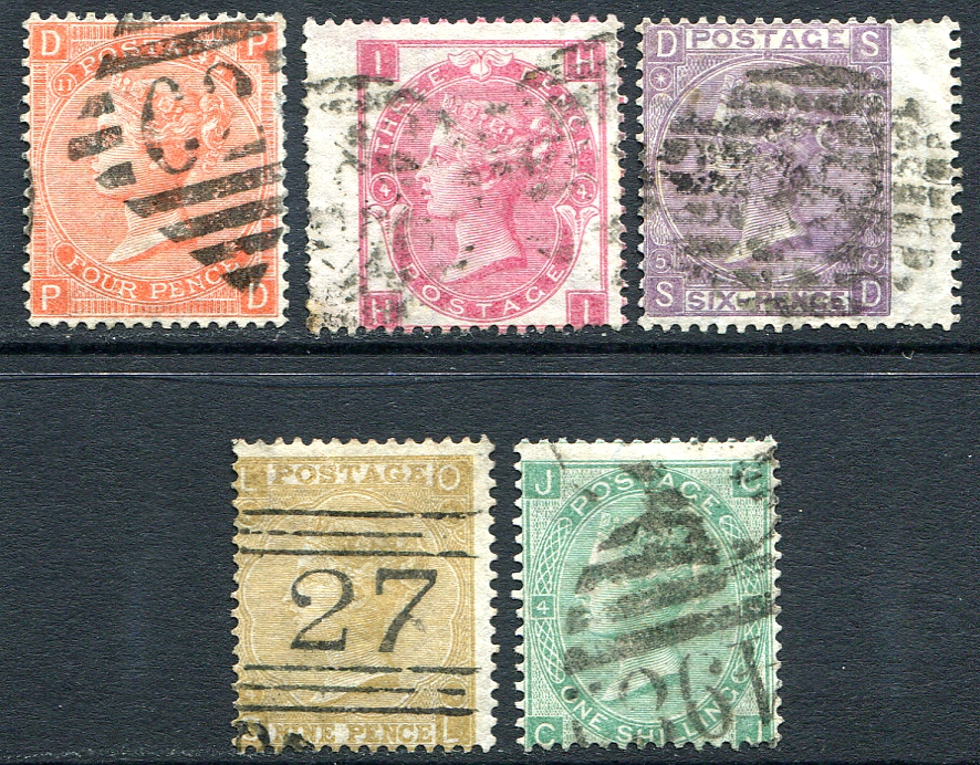 Quintet of 1865 used QV issues including the 4p vermillion, 3p pale rose, 6p lilac, 9p straw and 1sh green. A tidy group, which includes a couple premium postmarks and a couple "wing" margins. 2024 Scott US$1522.50 =
