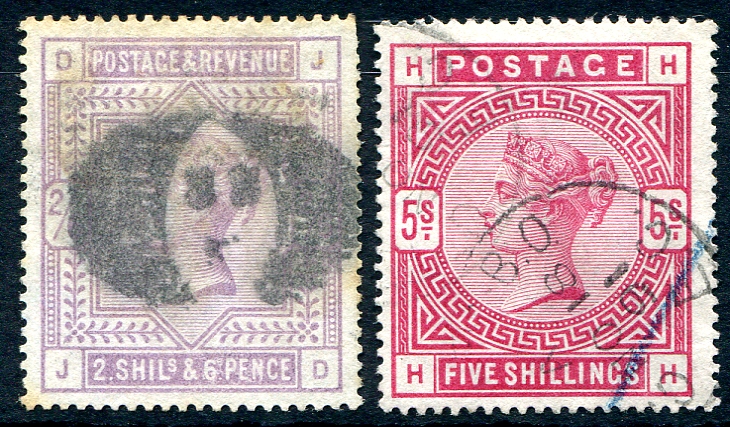 F/VF used examples of the 1883 issued 2sh6p lilac and 1884 issued 5sh carmine rose QV high-values. Attractive examples with reasonable postmarks, considering the high value of the stamps which would have been used primarily on parcels. 2024 Scott US$475.00 =