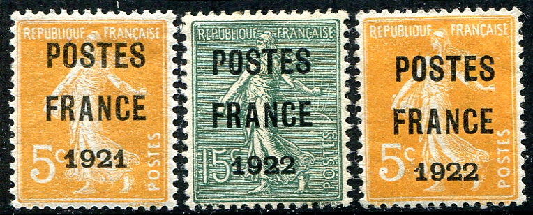Attractive trio of 1921/1922 French "Sower" precancels, with the 5c orange (1921 and 1922) and 15c slate green (1922). All mint, hinged, with the 15c value having some album adherence on the reverse. While not listed in Scott catalogue, these are listed in Yvert & Tellier. 2023 Yvert & Tellier €1830.00 =