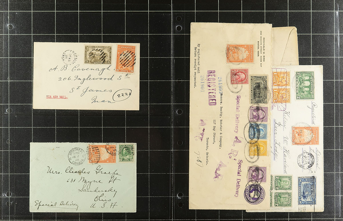 E3 Special Delivery Postal History. A wonderful assortment of 16 covers, all franked with the popular 1927 issued 20c vermilion Special Delivery stamp. One of the most popular issues of the time, showing the methods of mail travel. Includes local use, mixed franking with USA Stamps, airmail, registered, Admirals and postmarks. Take a good look at the scans to appreciate this group of seldom seen covers. Estimate =