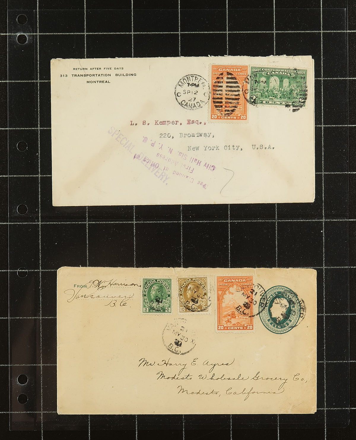 E3 Special Delivery Postal History. A wonderful assortment of 16 covers, all franked with the popular 1927 issued 20c vermilion Special Delivery stamp. One of the most popular issues of the time, showing the methods of mail travel. Includes local use, mixed franking with USA Stamps, airmail, registered, Admirals and postmarks. Take a good look at the scans to appreciate this group of seldom seen covers. Estimate =