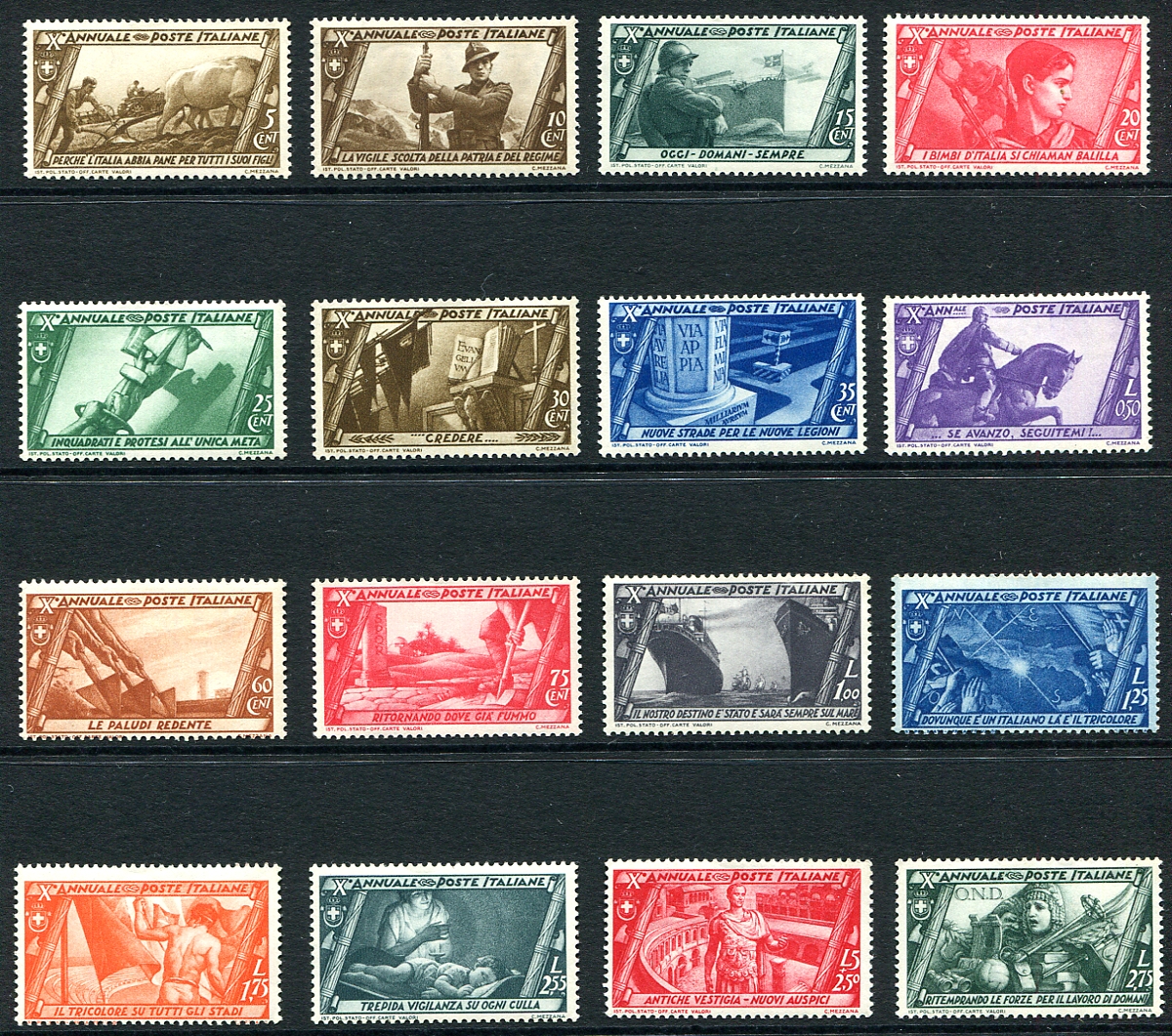 VF mint Never Hinged 1932 "10th Anniversary of the Fascist Government and the March on Rome" set of 16. Extremely fresh and attractive issues, very evocative imagery from the Fascist period of Italian governance. 2025 Scott US$455.00 =
