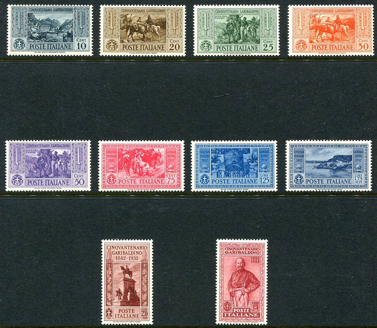 Complete mint Never Hinged set of the 1932 "Garibaldi" series. This attractive set of 10 stamps was issued on the 50th anniversary of the death of Giuseppe Garibaldi. An always popular series, with Post Office fresh colours (90+ years after issue). 2025 Scott US$600.00 =