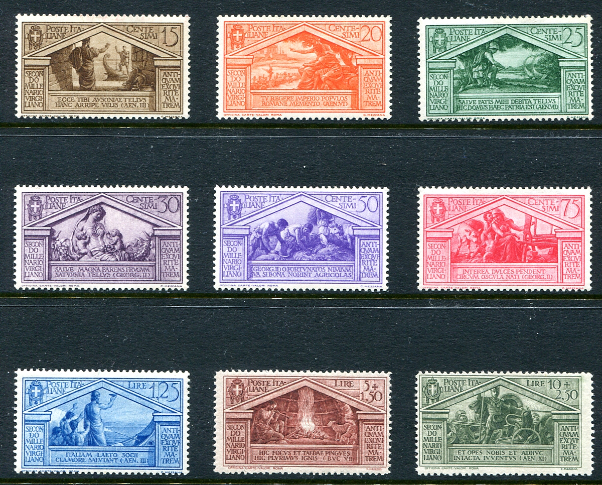 Complete mint Lightly Hinged set of the 1930 "Bimillenary of the birth of Virgil" series of 9 different designs. Post Office fresh colours throughout. 2025 Scott US$161.50 =