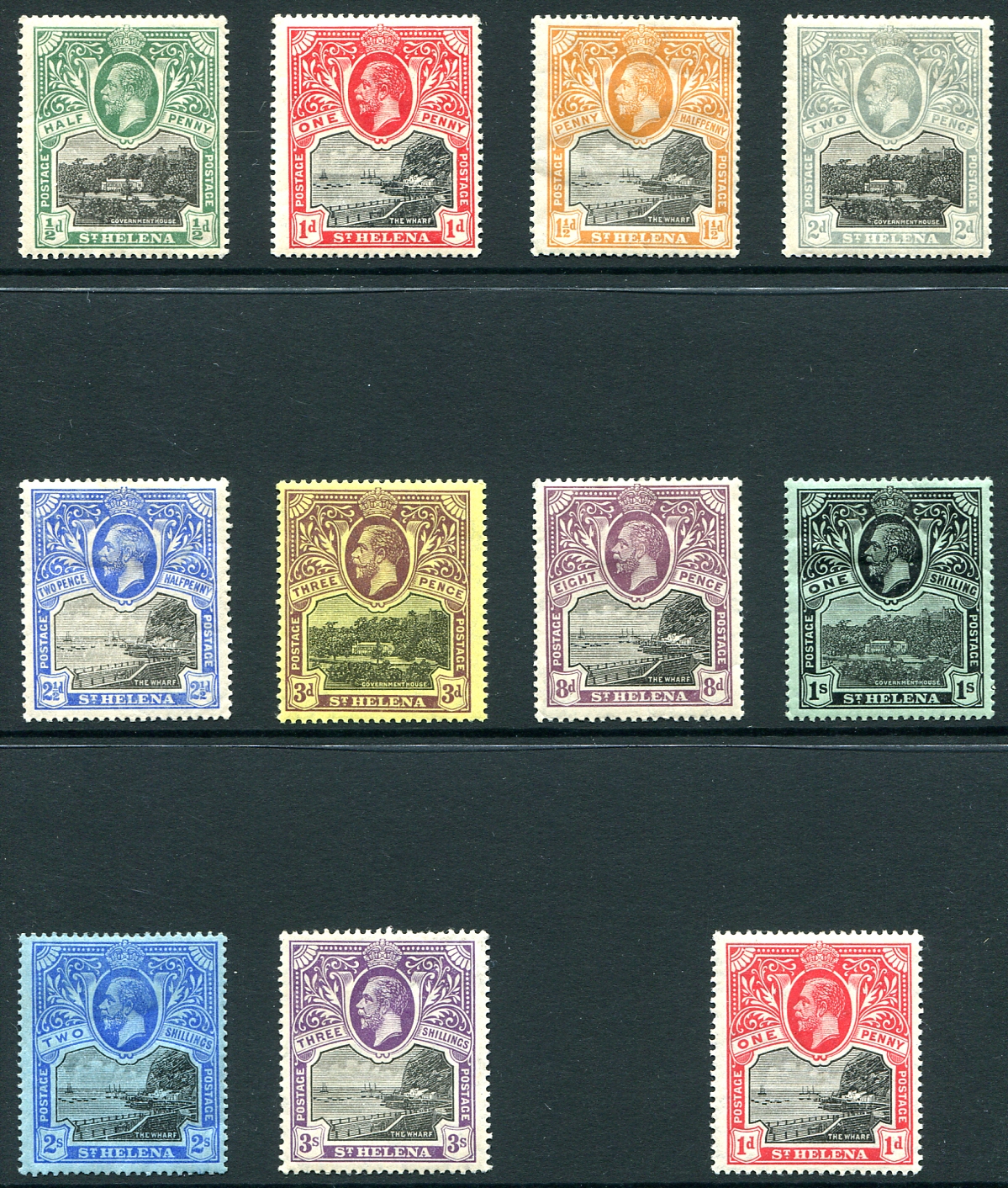Complete mint Lightly Hinged set of the 1912-1916 period GeoV "The Wharf" issues series of 10 stamps, plus the 1p scarlet and black Scott listed variety (#62a). A very pretty group, very hard to find. 2025 Scott US$191.75 =