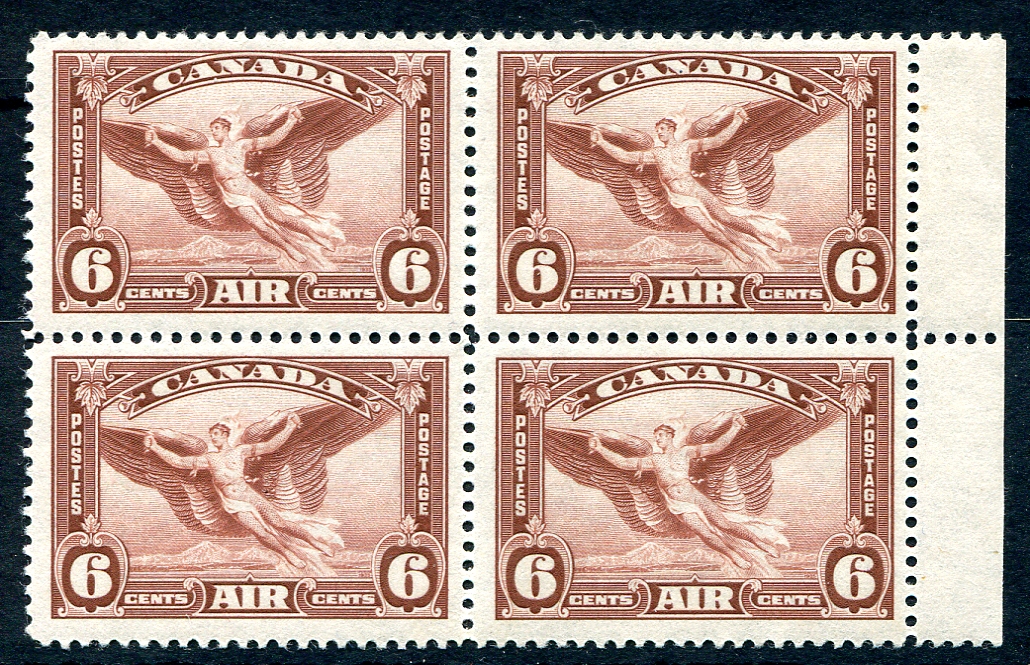 Fresh and VF mint, perfectly centered, LH example of the "Moulting Wing" variety on the 1935 issue 6c red brown Daedalus airmail stamp (plate #1, LR pane, position 14) as the upper-left stamp in a block of four. A scarce and popular constant plate flaw. 2024 Unitrade =