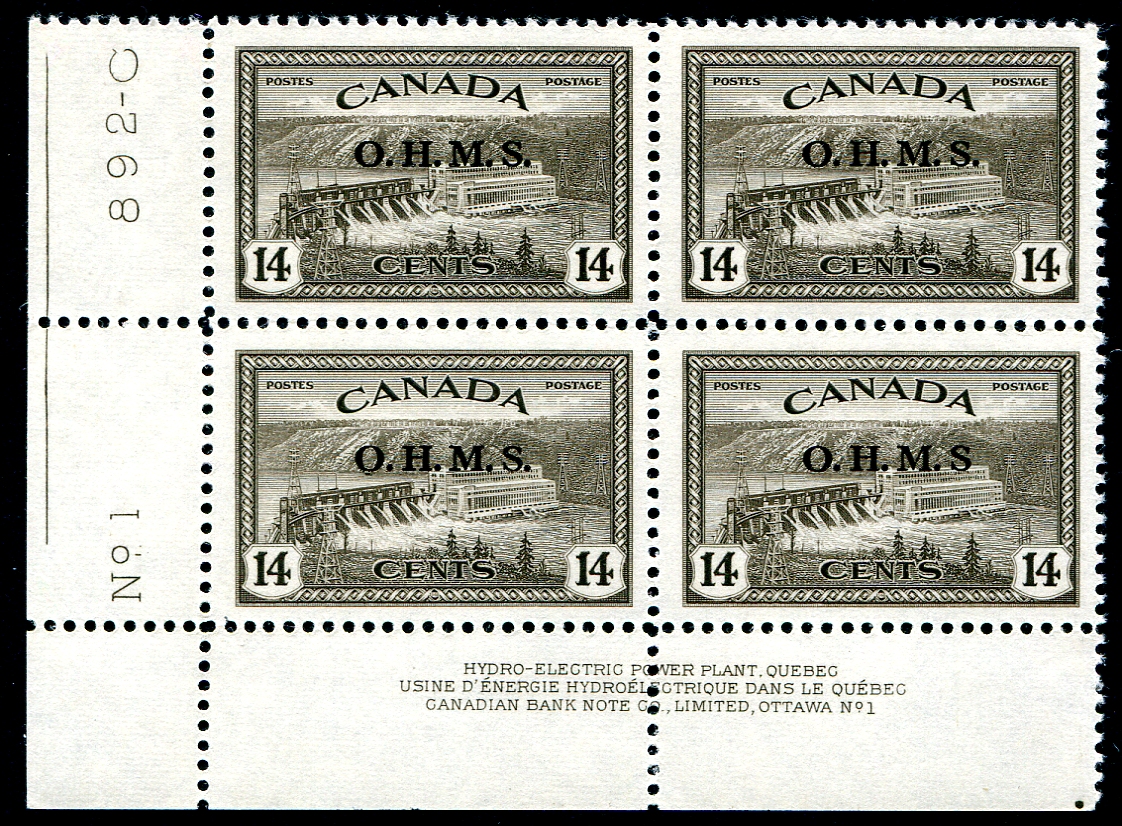 Pristine VF Mint Never Hinged lower-left plate #1 block of 4 with the 'No period after S' variety at position 47 (the lower right stamp in the block), 14c Hydroelectric Dam 1949-50 Official issue with "O.H.M.S." overprint. A choice positional multiple. 2024 Unitrade =