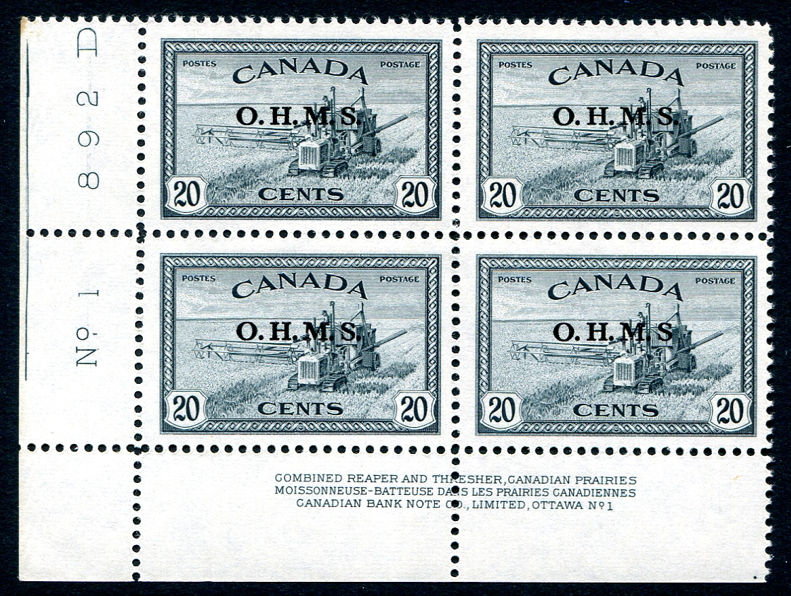Exceptional VF mint Never Hinged lower-left plate #1 block of 4 with the 'No period after S' variety at position 47, the lower right stamp, 20c Combine 1949-50 Official issue with "O.H.M.S.' overprint. A choice positional multiple. 2024 Unitrade =
