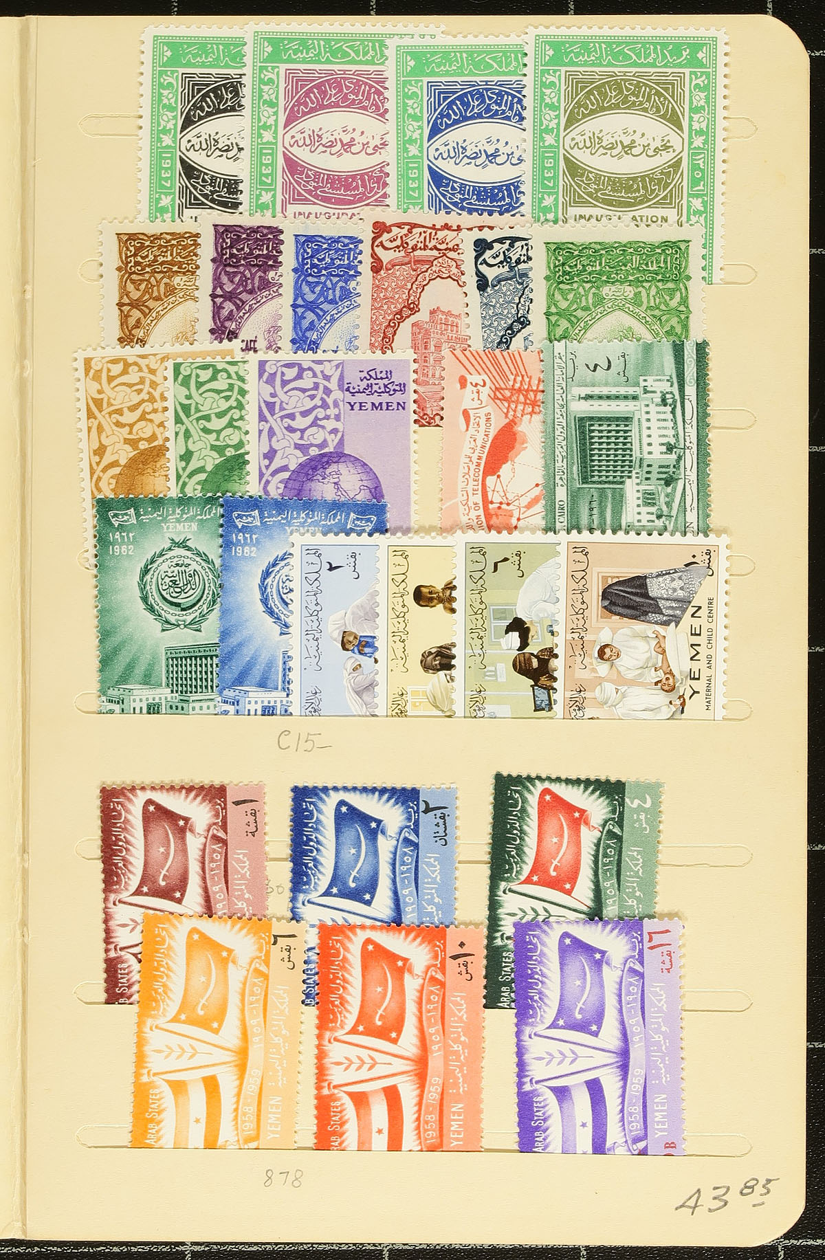 Small "Stamp Stock Book", containing an intriguing selection / holding of mint Never Hinged and used Yemen, including blocks and imperforates. Ranging from 1939-1962, including many complete sets. See the images and owner's "inventory" list to appreciated the scope of the lot. 2025 Scott US$358.25 =
