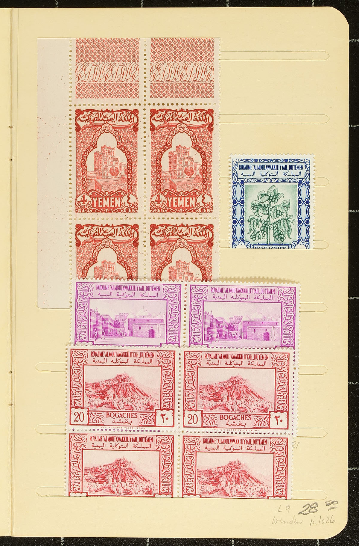 Small "Stamp Stock Book", containing an intriguing selection / holding of mint Never Hinged and used Yemen, including blocks and imperforates. Ranging from 1939-1962, including many complete sets. See the images and owner's "inventory" list to appreciated the scope of the lot. 2025 Scott US$358.25 =