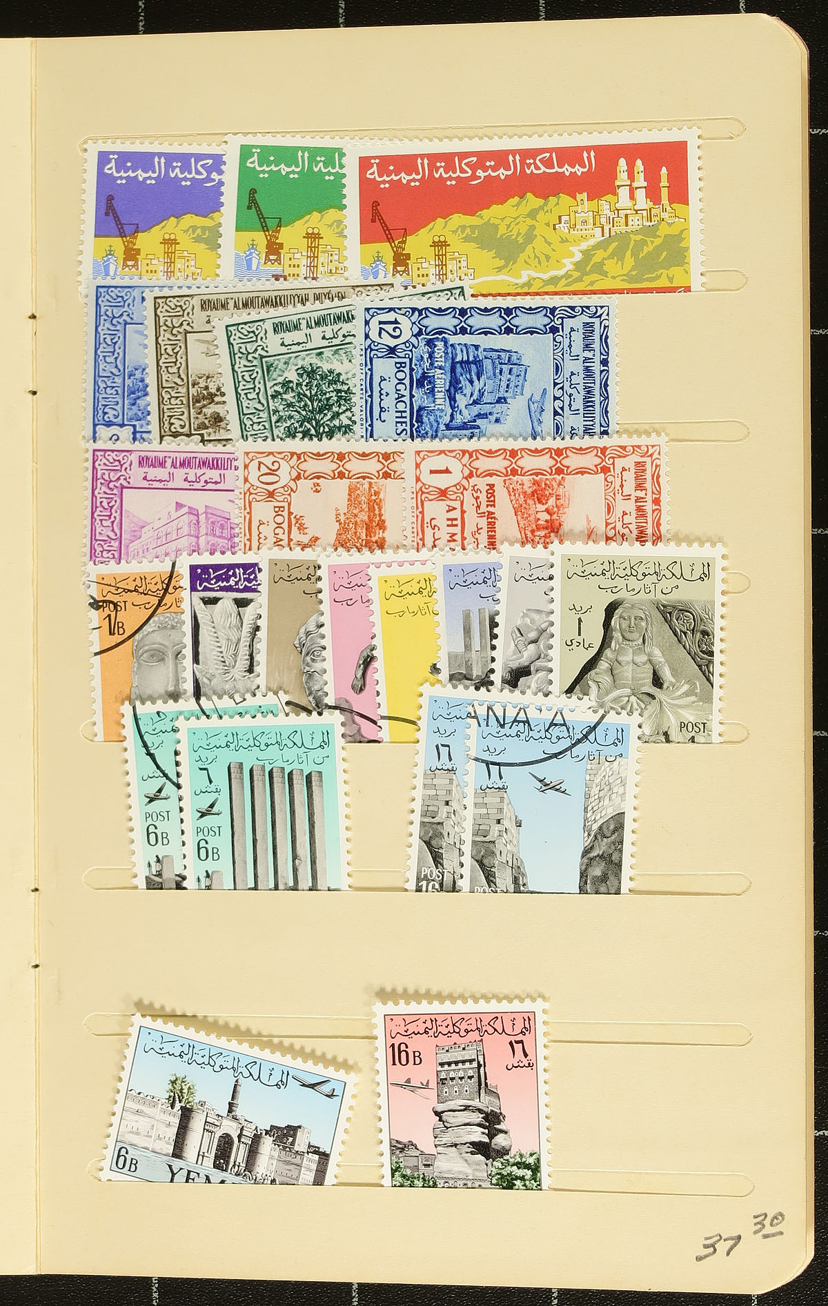 Small "Stamp Stock Book", containing an intriguing selection / holding of mint Never Hinged and used Yemen, including blocks and imperforates. Ranging from 1939-1962, including many complete sets. See the images and owner's "inventory" list to appreciated the scope of the lot. 2025 Scott US$358.25 =