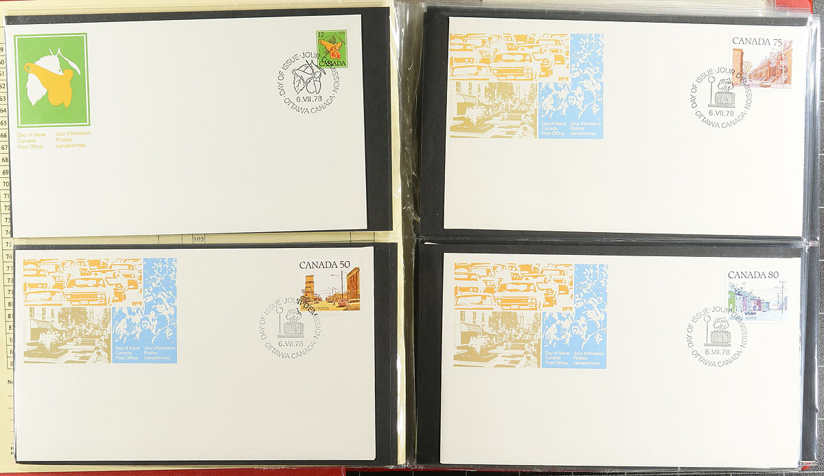 FDC Collection Part 1. An in-depth assembly of Canada Post issued FDC from the 1974-1985 period, largely complete for the period, neatly assembled in 5x Unisafe FDC albums. Each album has been counted for both number of FDC, but also the Face Value of the stamps (keep in mind, the original cost was over the face value!). Total number of FDC is 654, with a total face value of $277.63. Estimate =