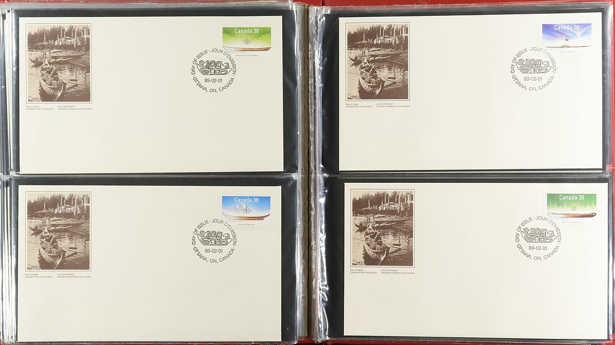 FDC Collection Part 2. An in-depth assembly of Canada Post issued FDC from the 1985-1998 period, largely complete for the period, neatly assembled in 5x Unisafe FDC albums. Each album has been counted for both number of FDC, but also the Face Value of the stamps (keep in mind, the original cost was over the face value!). Total number of FDC is 533, with a total face value of $494.17. Estimate =