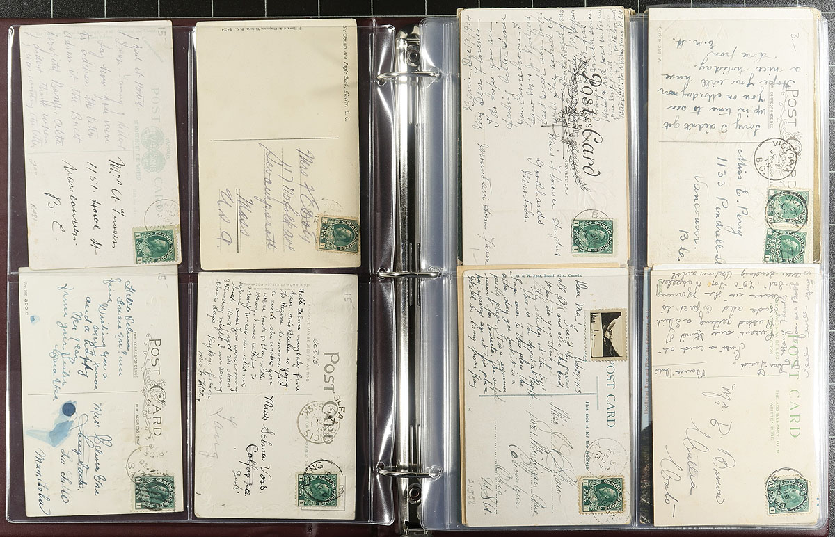Admiral Postal History / Postcard Accumulation Part 1. A collector's journey of collecting Admiral franked postcards. This portion consists of two full binders, with 395 postcards, all selected for George V Admiral frankings and cancelled with CDS postmarks from across the country. Displayed on clear 4-pocket pages, all pages (except the first) arranged with 8 cards per-page, with the postally used side showing outwards. An excellent opportunity for the postmark or Admiral hound, with 4 large lots offered in this sale. Estimate =