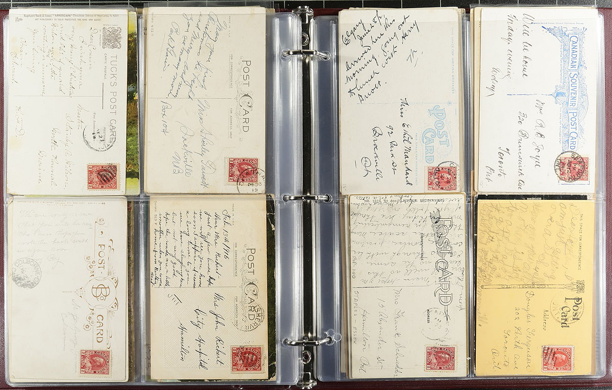 Admiral Postal History / Postcard Accumulation Part 1. A collector's journey of collecting Admiral franked postcards. This portion consists of two full binders, with 395 postcards, all selected for George V Admiral frankings and cancelled with CDS postmarks from across the country. Displayed on clear 4-pocket pages, all pages (except the first) arranged with 8 cards per-page, with the postally used side showing outwards. An excellent opportunity for the postmark or Admiral hound, with 4 large lots offered in this sale. Estimate =