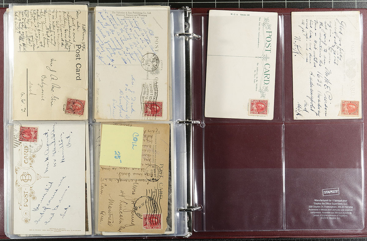 Admiral Postal History / Postcard Accumulation Part 1. A collector's journey of collecting Admiral franked postcards. This portion consists of two full binders, with 395 postcards, all selected for George V Admiral frankings and cancelled with CDS postmarks from across the country. Displayed on clear 4-pocket pages, all pages (except the first) arranged with 8 cards per-page, with the postally used side showing outwards. An excellent opportunity for the postmark or Admiral hound, with 4 large lots offered in this sale. Estimate =