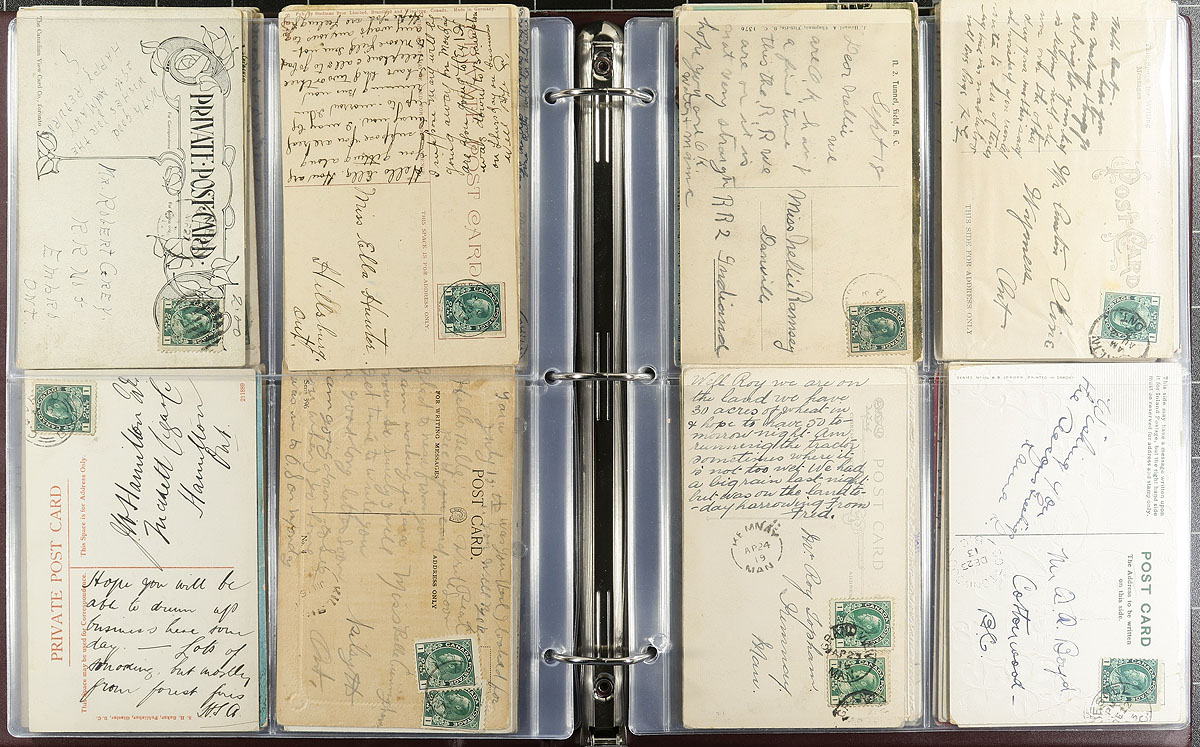 Admiral Postal History / Postcard Accumulation Part 1. A collector's journey of collecting Admiral franked postcards. This portion consists of two full binders, with 395 postcards, all selected for George V Admiral frankings and cancelled with CDS postmarks from across the country. Displayed on clear 4-pocket pages, all pages (except the first) arranged with 8 cards per-page, with the postally used side showing outwards. An excellent opportunity for the postmark or Admiral hound, with 4 large lots offered in this sale. Estimate =