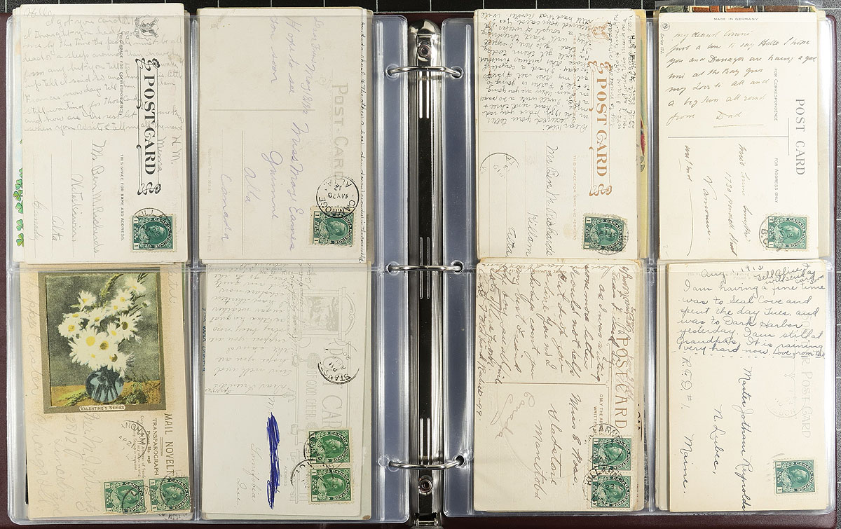 Admiral Postal History / Postcard Accumulation Part 1. A collector's journey of collecting Admiral franked postcards. This portion consists of two full binders, with 395 postcards, all selected for George V Admiral frankings and cancelled with CDS postmarks from across the country. Displayed on clear 4-pocket pages, all pages (except the first) arranged with 8 cards per-page, with the postally used side showing outwards. An excellent opportunity for the postmark or Admiral hound, with 4 large lots offered in this sale. Estimate =